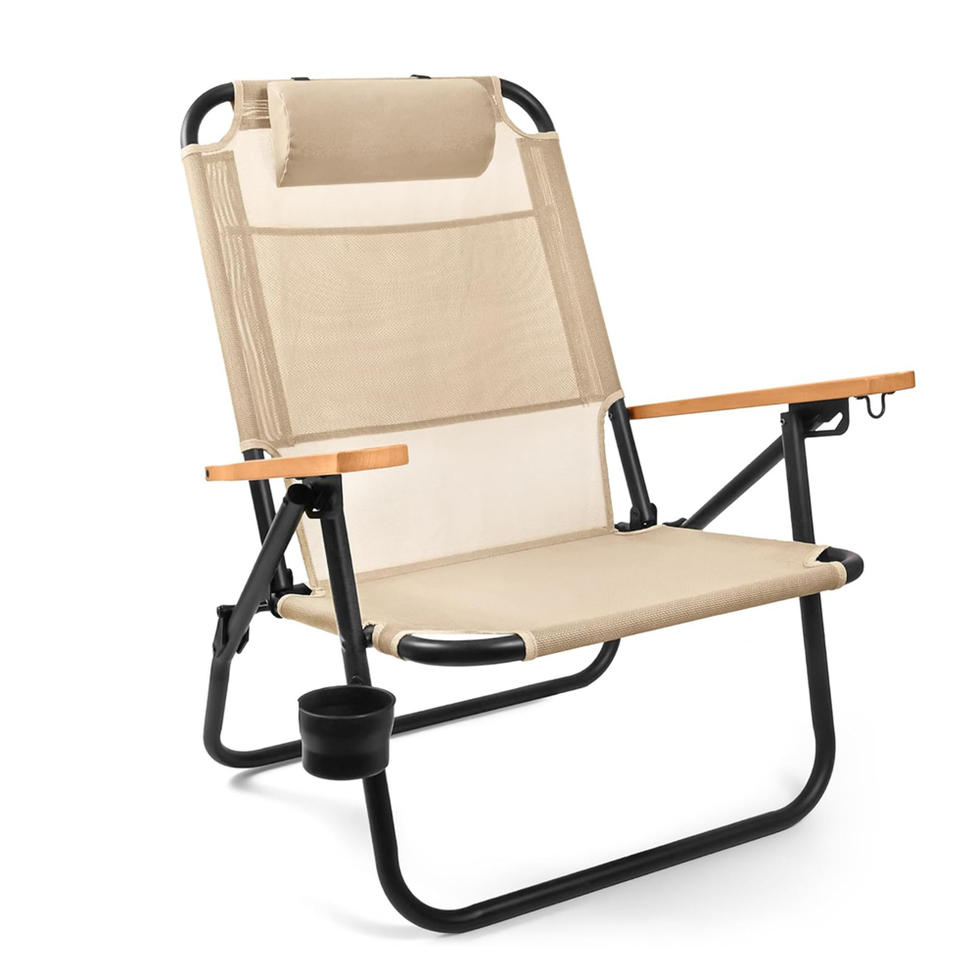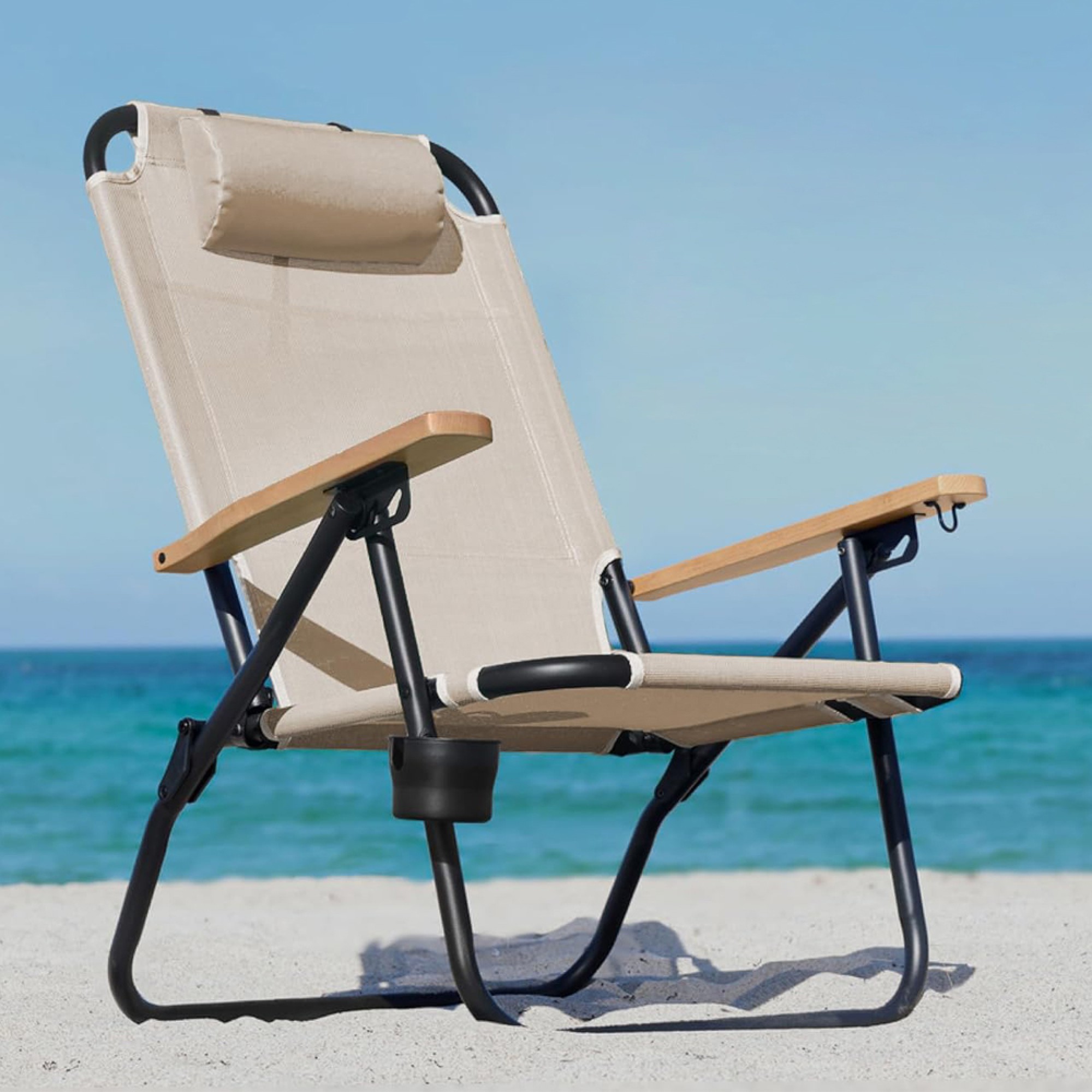 Καρεκλάκι παραλίας. Διαστάσεις: 88x67x68cm. Σκελετός Αλουμινίου Ø24mm με μαύρη ηλεκτροστατική βαφή & ξύλινα μπράτσα. Ανάκληση 3 θέσεων. Διαθέτει μαξιλάρι, αποσπώμενη θήκη ποτηριού και κρεμάστρα. Κατασκευασμένο από Textilene 1x1, υψηλής ποιότητας. Mε ιμάντες πλάτης τύπου backpack για εύκολή μεταφορά. Μέγιστο στατικό βάρος 100kg. Χρώμα Μπεζ. MAUI&SONS