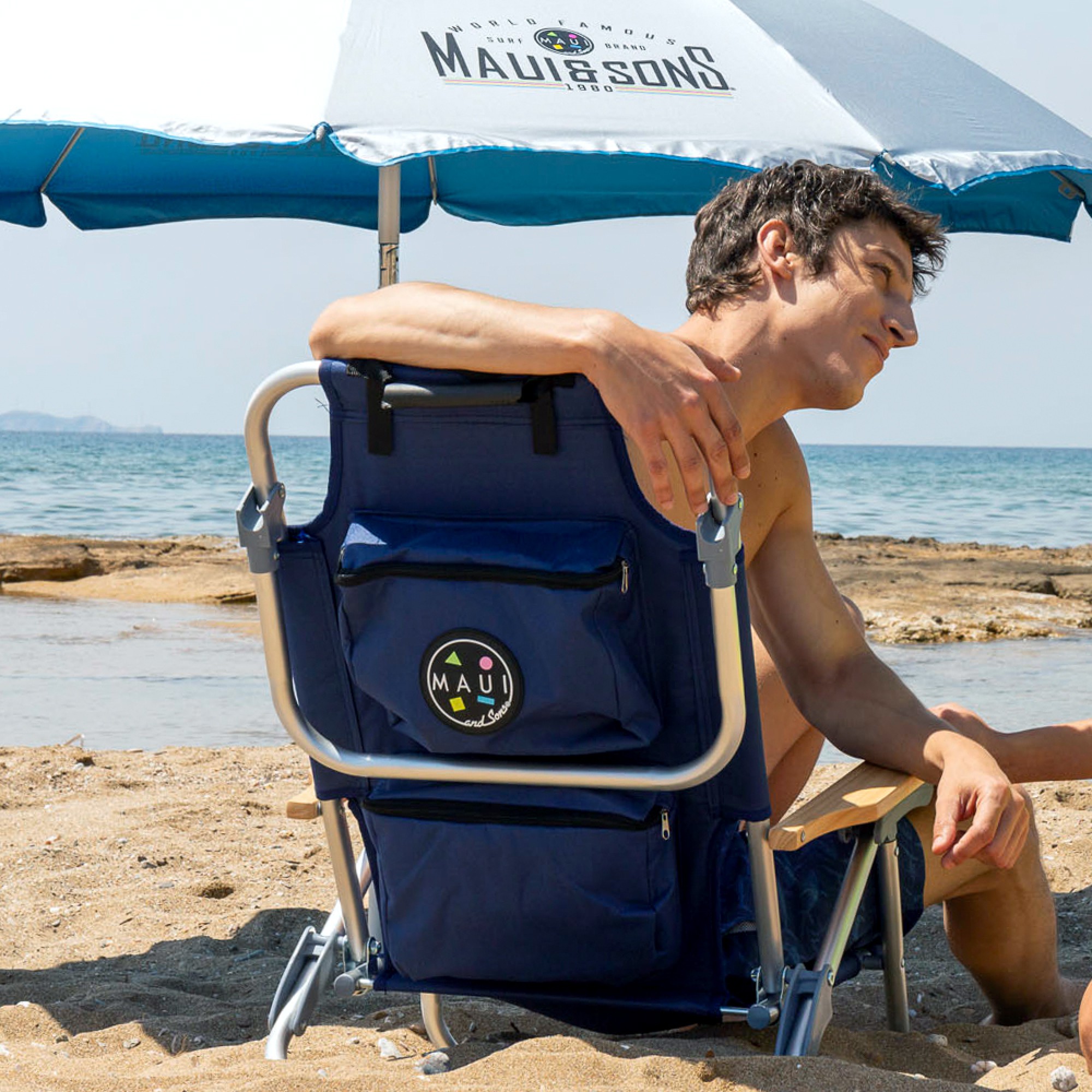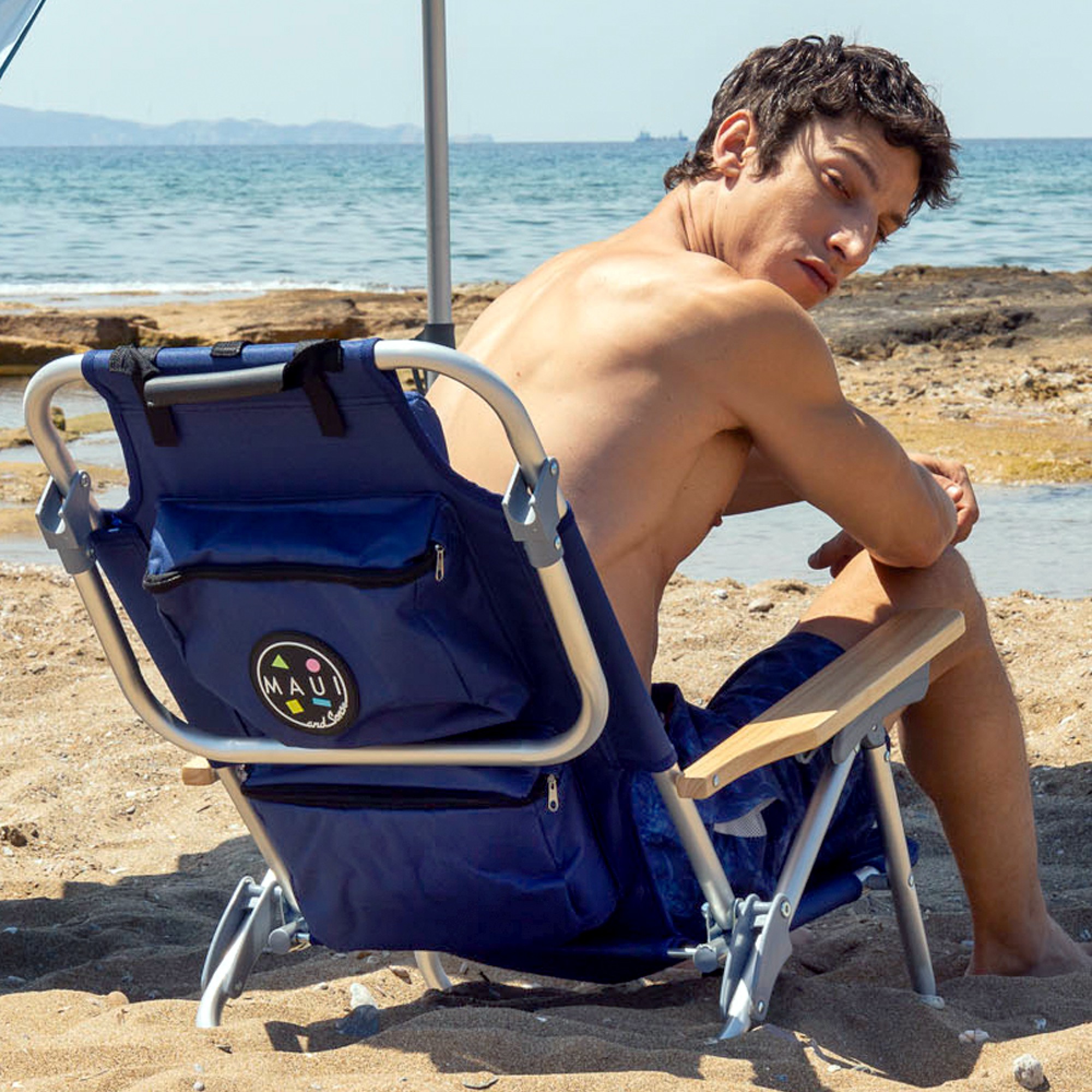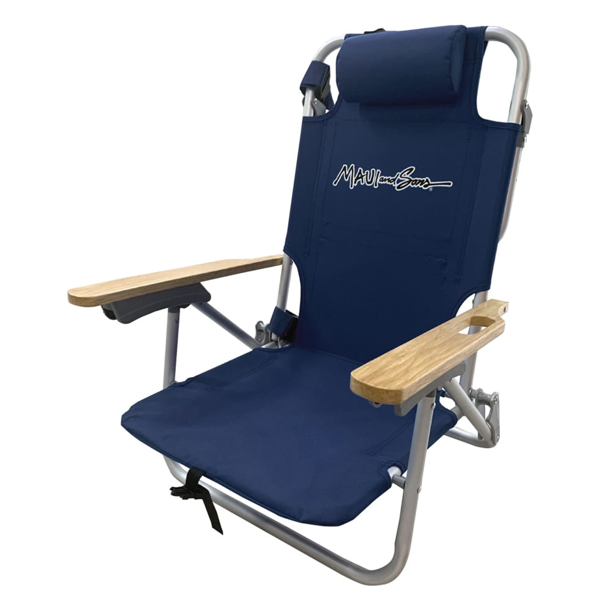 Καρεκλάκι παραλίας. Διαστάσεις: 74,50x60x61,50cm. Delux Σκελετός Αλουμινίου Ø22mm με ξύλινα μπράτσα από Ιαπωνική Βελανιδιά. Ανάκληση 5 θέσεων, μαξιλάρι,θήκη αποθήκευσης αντικειμένων και ισοθερμική θήκη. Ύφασμα Πολυεστερικό 600D, με πρακτικό ιμάντα και χειρολαβή μεταφοράς. Μέγιστο στατικό βάρος 100kg. Χρώμα Navy blue. MAUI&SONS