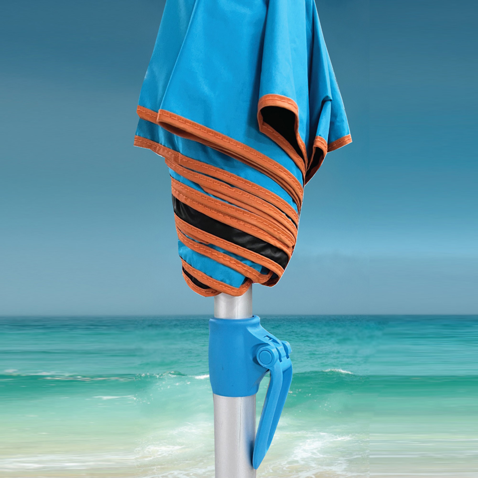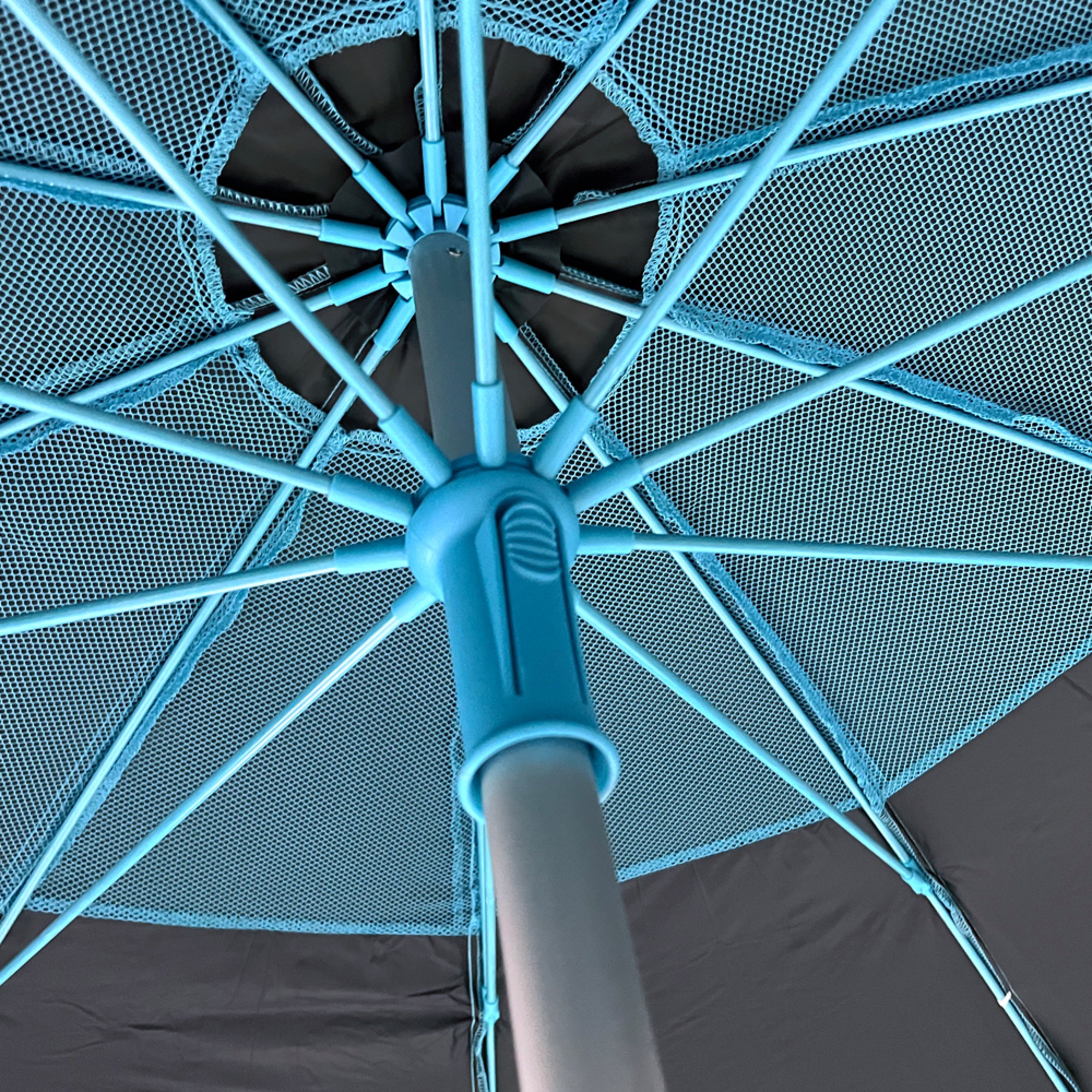 Ομπρέλα θαλάσσης ultra light 220/10 polyester pongee 190T BLACK-OUT XL. Άξονας ελαφρύς αλουμινίου σε φυσικό χρώμα αλουμινίου, 10 ακτίνες fiberglass μπλε, μήκος ακτίνας 110cm και πάχος 6,00mm, πάχος κεντρικού άξονα 29mm, πάχος ορθοστάτη 32mm. Χωρίς μηχανισμό κλίσης. Με 5 ειδικές υποδοχές στις ακτίνες για εντατήρες στερέωσης στο έδαφος (δεν περιλαμβάνονται). Ύφασμα polyester pongee 190T με εσωτερική επίστρωση Black Anti-UV, αεραγωγός με δίχτυ (mesh) για βέλτιστη αποσυμφόρηση του αέρα κατά τη χρήση, χρώμα εξωτερικά μπλε και εσωτερικά μαύρο. Άριστη προστασία από την ηλιακή ακτινοβολία, UPF 50+, μπλοκάρει το 98% των επιβλαβών ακτινών UV. Υφασμάτινη θήκη μεταφοράς με κορδόνι ώμου. MAUI & SONS