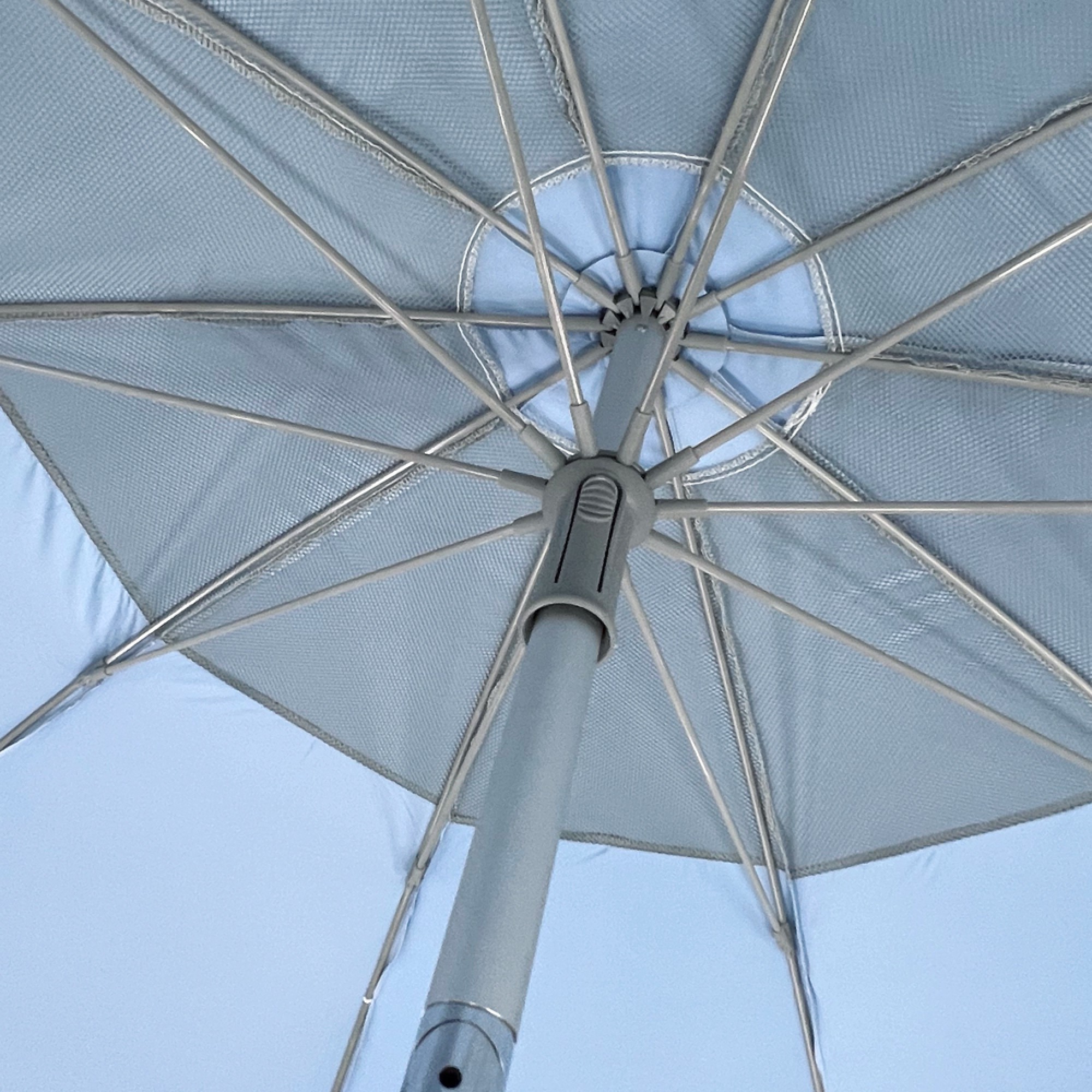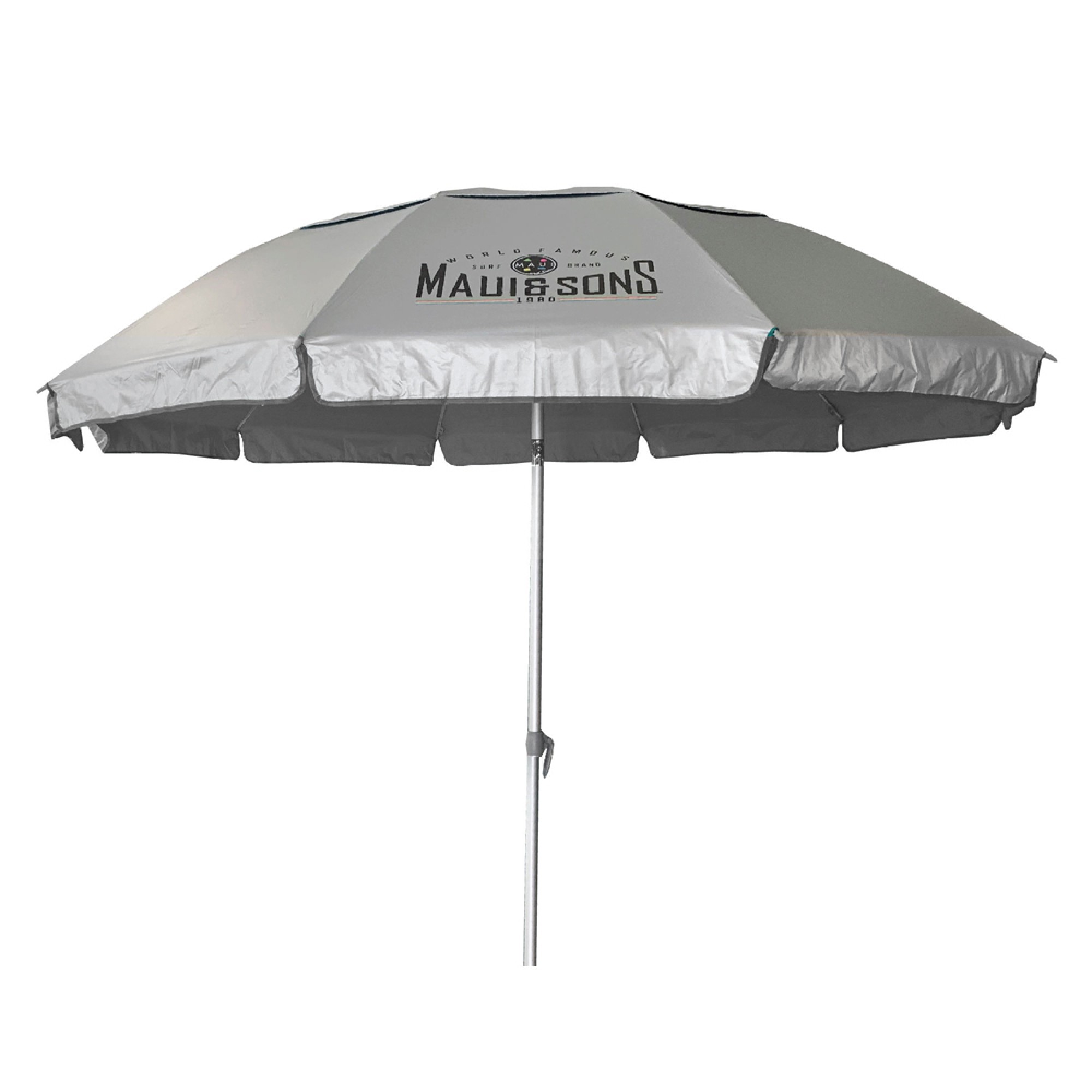 Ομπρέλα θαλάσσης ultra light 220/10 polyester pongee 190T (XL). Άξονας ελαφρύς αλουμινίου σε φυσικό χρώμα αλουμινίου. 10 ακτίνες fiberglass γκρι με μήκος ακτίνας 110cm και πάχος 6,00mm. Πάχος κεντρικού άξονα 29mm και πάχος ορθοστάτη 32mm. Με ενισχυμένο μεταλλικό μηχανισμό κλίσης από κράμα ψευδαργύρου. Με 5 ειδικές υποδοχές στις ακτίνες για εντατήρες στερέωσης στο έδαφος (δεν περιλαμβάνονται). Ύφασμα polyester pongee 190T με πολλαπλή επίστρωση silver coating, αεραγωγός με δίχτυ (mesh) για βέλτιστη αποσυμφόρηση του αέρα κατά την χρήση. Χρώμα εξωτερικά ασημί και εσωτερικά χρωματιστό. Άριστη προστασία από την ηλιακή ακτινοβολία UPF 50+, μπλοκάρει το 98% των επιβλαβών ακτινών UV. Υφασμάτινη θήκη μεταφοράς με κορδόνι ώμου. Χρώμα γκρι. MAUI & SONS