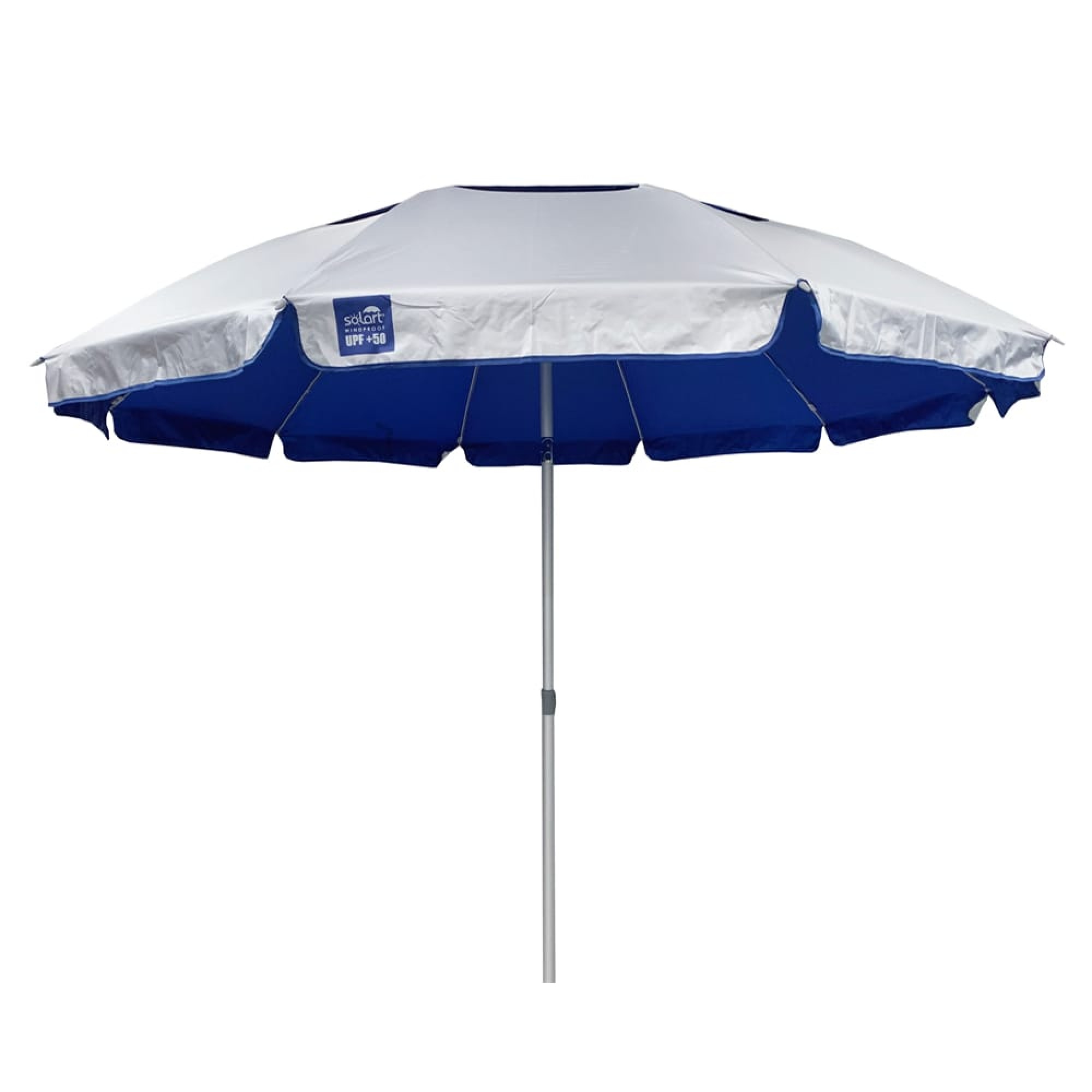 Ομπρέλα θαλάσσης ultra light 220/10 (XL). Άξονας ελαφρύς αλουμινίου σε φυσικό χρώμα αλουμινίου. 10 ακτίνες fiberglass γκρι με μήκος ακτίνας 110cm πάχος 6,00mm. Πάχος κεντρικού άξονα 29mm και πάχος ορθοστάτη 32mm. Με ενισχυμένο μεταλλικό μηχανισμό κλίσης από κράμα ψευδαργύρου. Με 5 ειδικές υποδοχές στις ακτίνες για εντατήρες στερέωσης στο έδαφος (δεν περιλαμβάνονται). Ύφασμα polyester pongee 190T με πολλαπλή επίστρωση silver coating, αεραγωγός με δίχτυ(mesh) για βέλτιστη αποσυμφόρηση του αέρα κατά την χρήση, χρώμα εξωτερικά ασημί και εσωτερικά χρωματιστό (μπλε ή γκρι). Άριστη προστασία από την ηλιακή ακτινοβολία UPF 50+, μπλοκάρει το 98% των επιβλαβών ακτινών UV. Υφασμάτινη θήκη μεταφοράς με κορδόνι ώμου. Χρώμα μπλε. SOLART