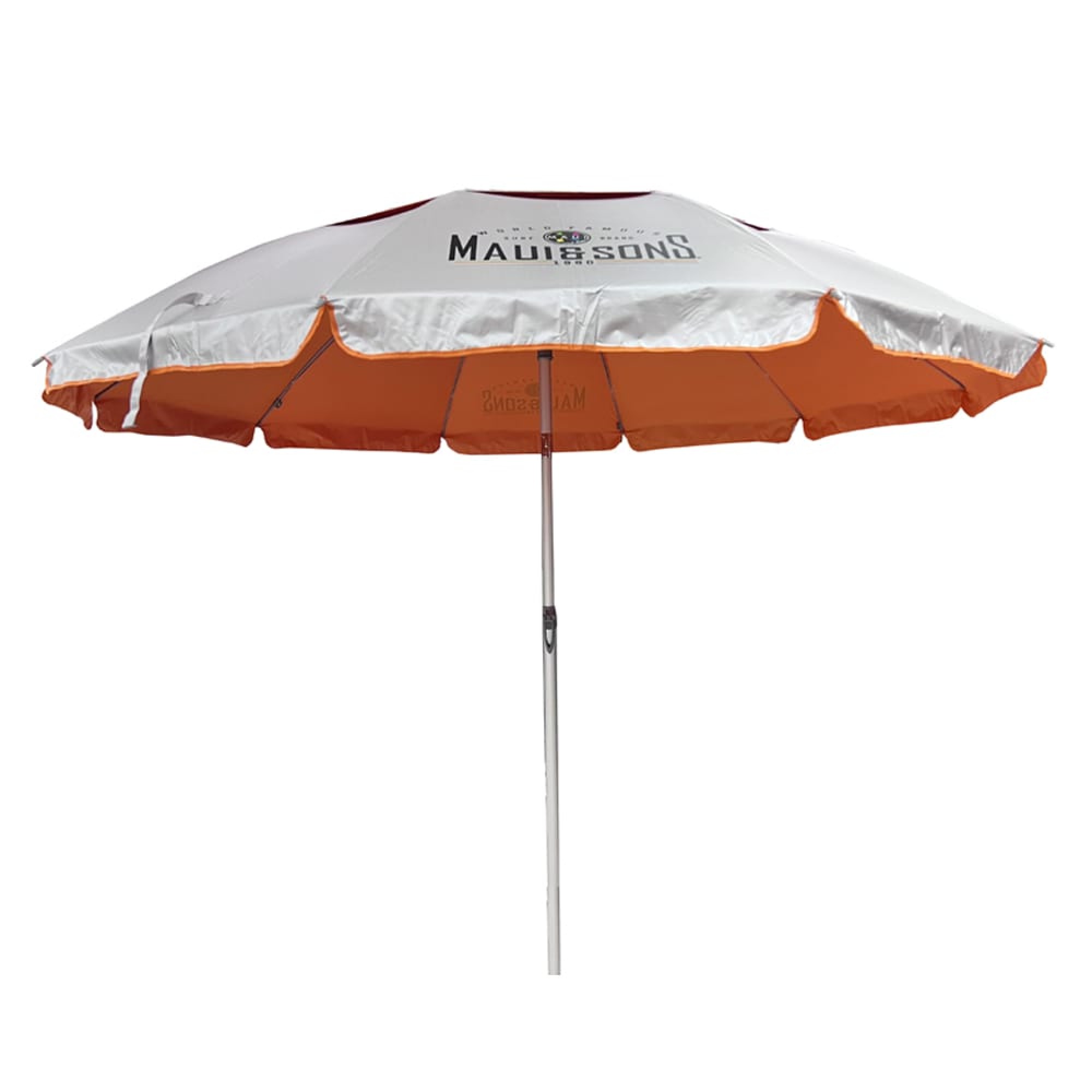Ομπρέλα θαλάσσης ultra light 220/10 polyester pongee 190T (XL). Άξονας ελαφρύς αλουμινίου σε φυσικό χρώμα αλουμινίου, 10 ακτίνες fiberglass γκρι, μήκος ακτίνας 110cm πάχος 6,00mm, πάχος κεντρικού άξονα 29mm, πάχος ορθοστάτη 32mm. Με ενισχυμένο μεταλλικό μηχανισμό κλίσης από κράμα ψευδαργύρου. Με 5 ειδικές υποδοχές στις ακτίνες για εντατήρες στερέωσης στο έδαφος (δεν περιλαμβάνονται). Ύφασμα polyester pongee 190T με πολλαπλή επίστρωση silver coating, αεραγωγός με δίχτυ (mesh) για βέλτιστη αποσυμφόρηση του αέρα κατά την χρήση, χρώμα εξωτερικά ασημί και εσωτερικά χρωματιστό. Άριστη προστασία από την ηλιακή ακτινοβολία , UPF 50+, μπλοκάρει το 98% των επιβλαβών ακτινών UV. Υφασμάτινη θήκη μεταφοράς με κορδόνι ώμου. Χρώμα πορτοκαλί. MAUI & SONS