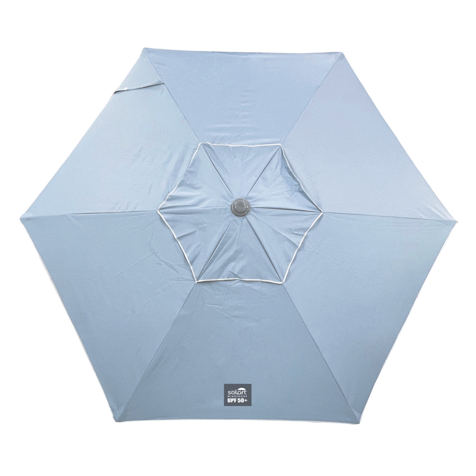 Ομπρέλα Θαλάσσης 230/6 polyester 140 gr/m². Άξονας μεταλλικός από χάλυβα, βαμμένος με ηλεκτροστατική βαφή σε γκρι χρώμα, διατομής 32/35 mm, 6 ακτίνες μεταλλικές, μήκος ακτίνας 115cm, διατομής 12x18x0,50 mm, ύψος 2,3m. Ύφασμα polyester 140 gr/m² με επίστρωση silver coating, αεραγωγός για βέλτιστη αποσυμφόρηση του αέρα κατά τη χρήση. Άριστη προστασία από την ηλιακή ακτινοβολία, UPF 50+. Υφασμάτινη θήκη μεταφοράς. Χρώμα σιέλ. SOLART