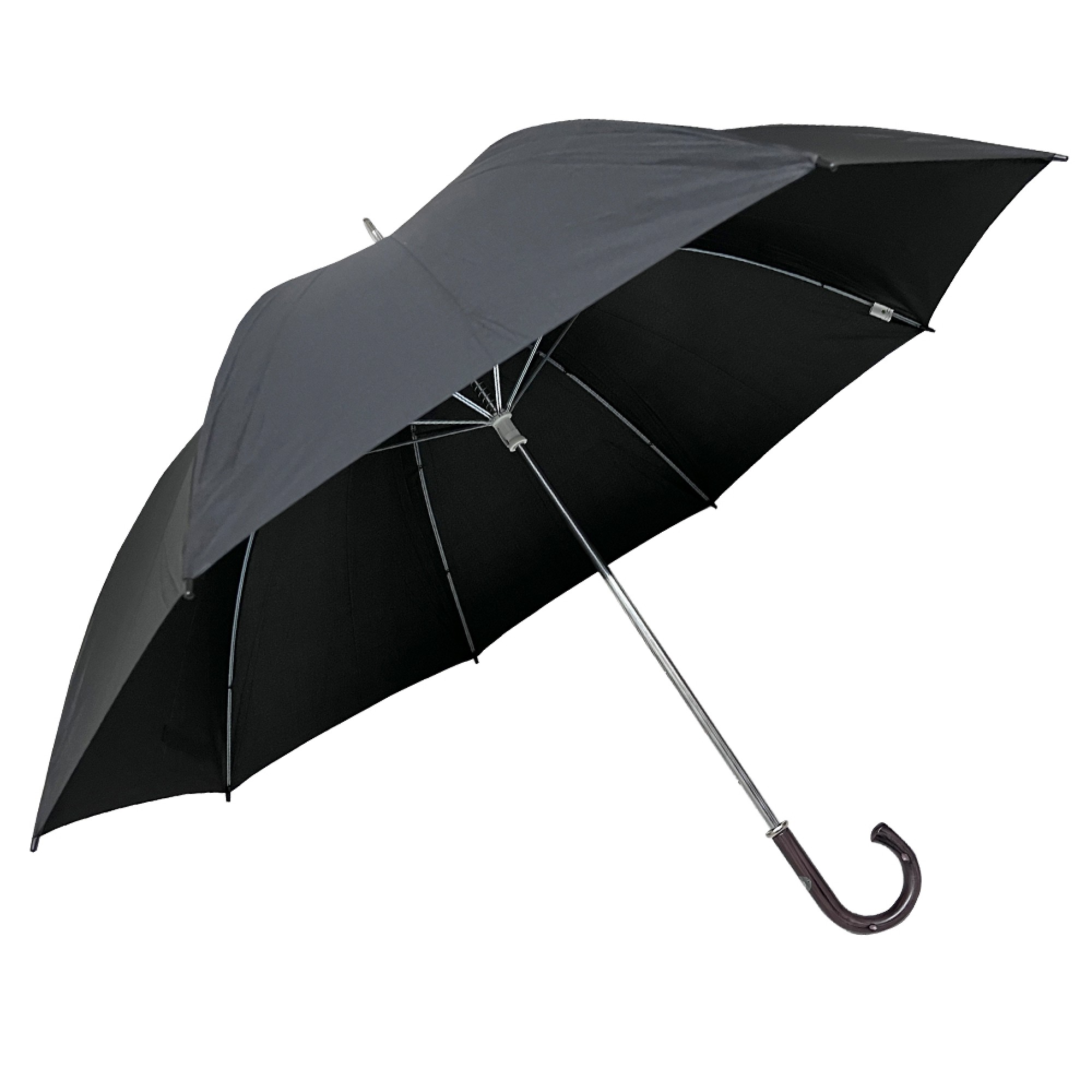 Ομπρέλα συνοδείας μονοκόμματη με χειροκίνητο άνοιγμα, μεταλλικό σκελετό 14mm, 8 διπλές ακτίνες μήκους 75cm, διάμετρος ανοιχτής ομπρέλας ≈ 130cm, 100% polyester pongee μαύρο και λαβή με απομίμιση ξύλου μαγκούρα. CHANOS