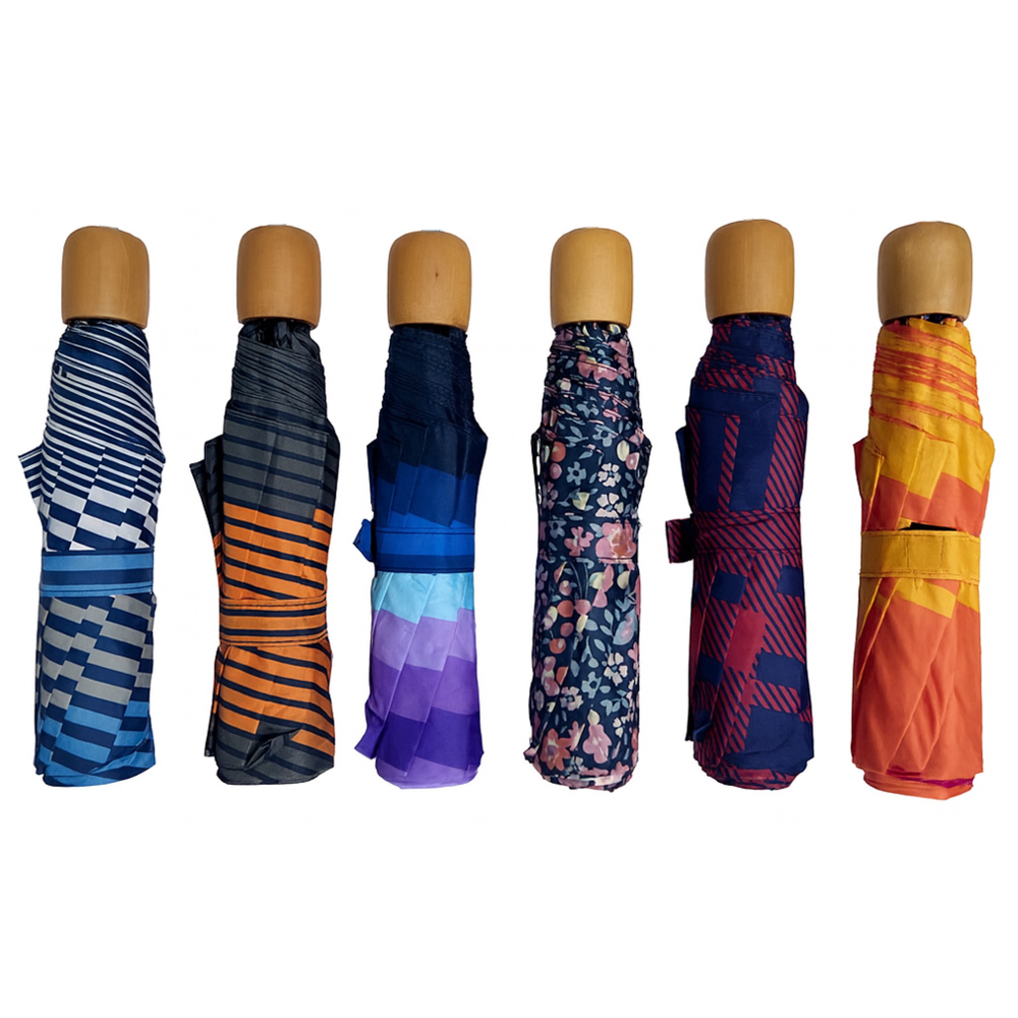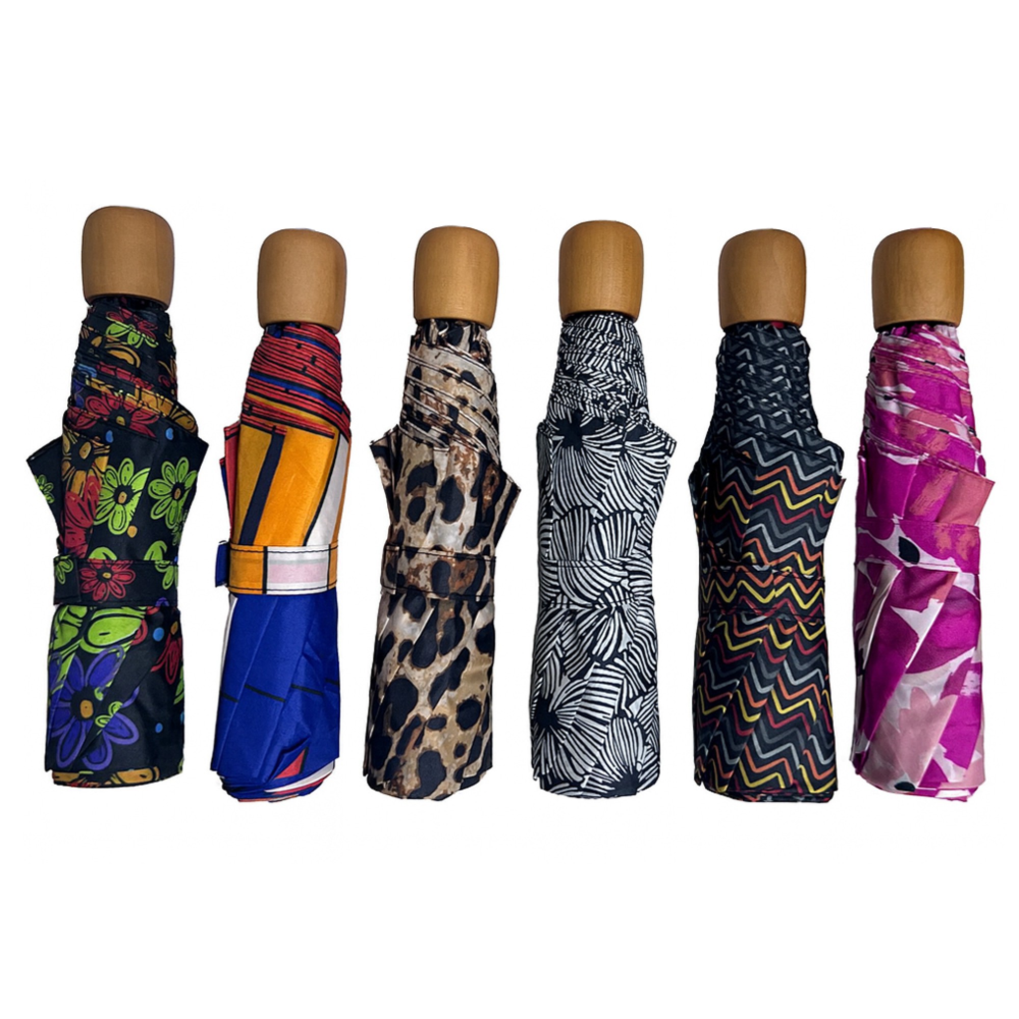 Ομπρέλα γυναικεία 3σπαστη με χειροκίνητο άνοιγμα, μεταλλικό μαύρο σκελετό, 8 ακτίνες μήκους 53cm, διάμετρος ανοιχτής ομπρέλας ≈ 103cm, ύφασμα 100% polyester εμπριμέ και λαβή ξύλινη. Διατίθεται σε 12 σχέδια. TREND