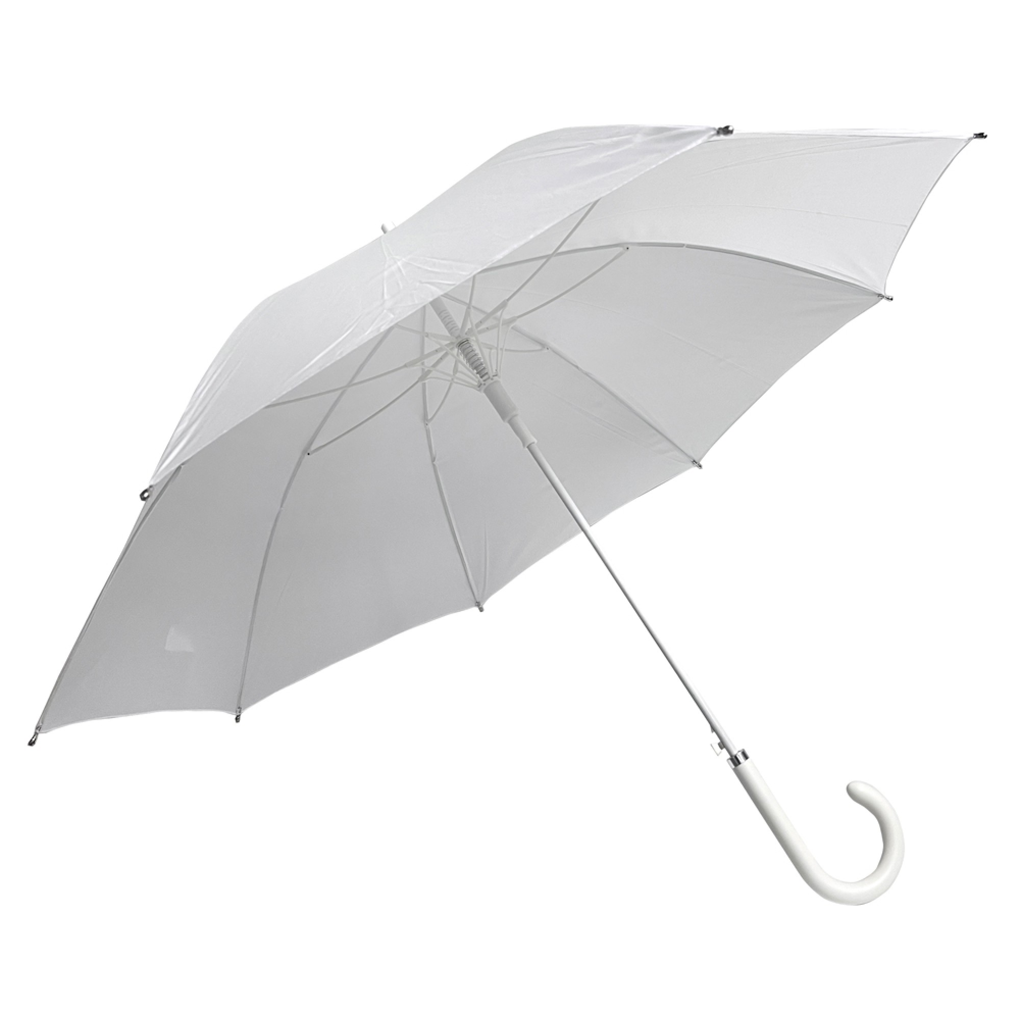 Ομπρέλα νυφική μονοκόμματη με αυτόματο άνοιγμα, μεταλλικό λευκό άξονα 9mm, 8 ακτίνες fiberglass μήκους 58cm, διάμετρος ανοιχτής ομπρέλας ≈ 103cm, ύφασμα 100% polyester pongee λευκό και λαβή λευκή πλαστική μαγκούρα. CHANOS