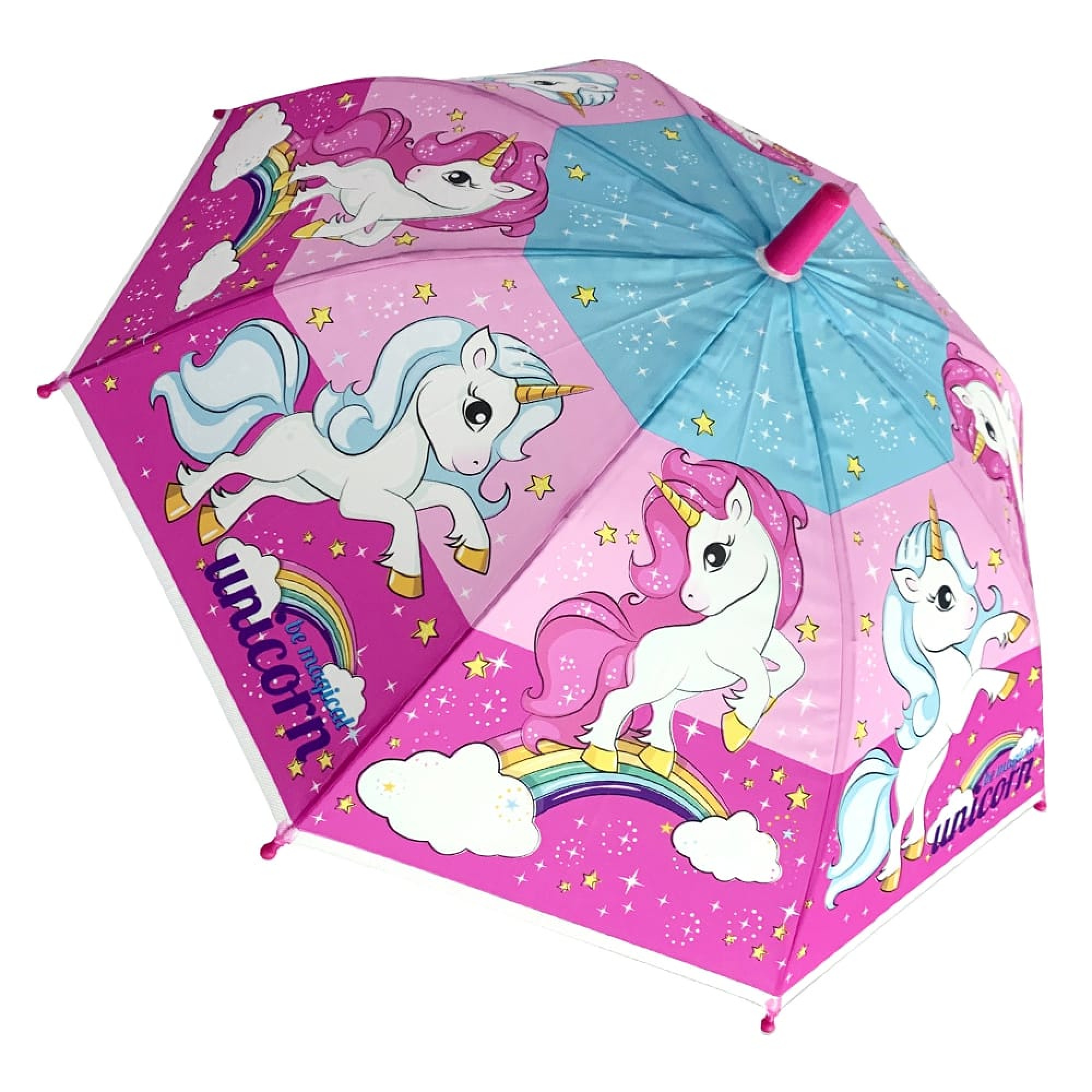 Ομπρέλα παιδική μονοκόμματη με χειροκίνητο άνοιγμα ασφαλείας, μεταλλικό άξονα, 8 ακτίνες μήκους 38cm fiberglass, αντιανεμική, διάμετρος ανοιχτής ομπρέλας ≈ 76cm, POE embossed και λαβή μαγκούρα, UNICORN RAINBOW