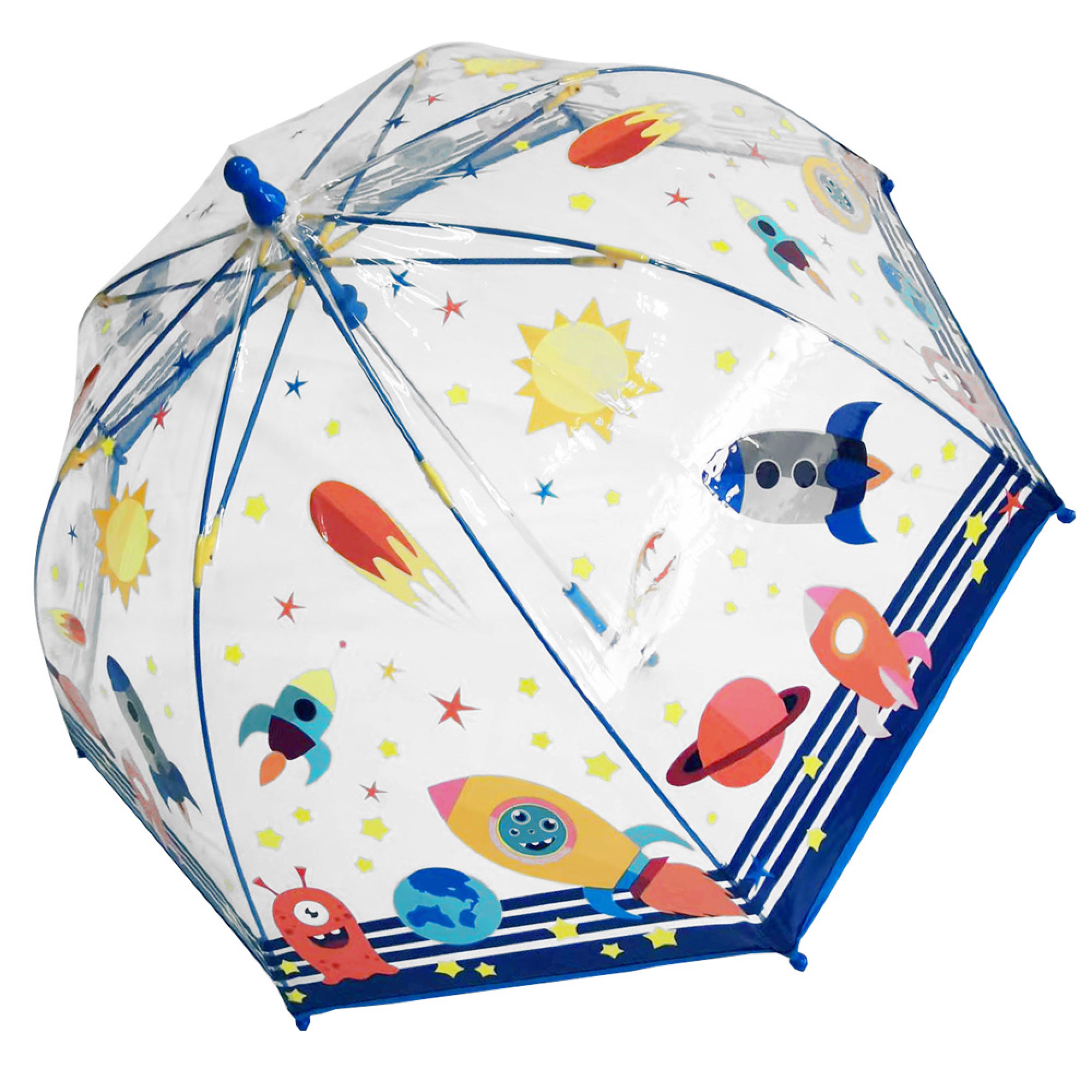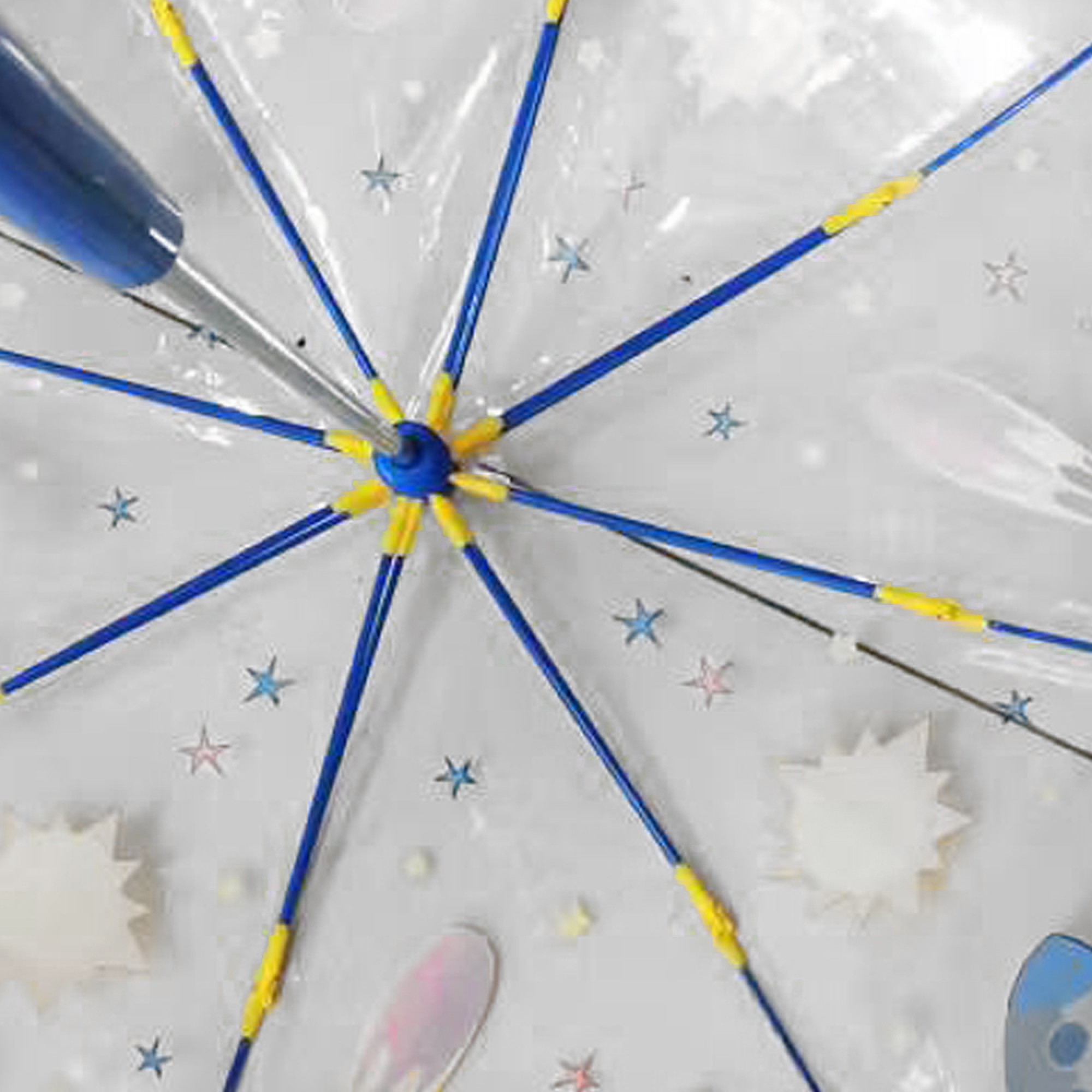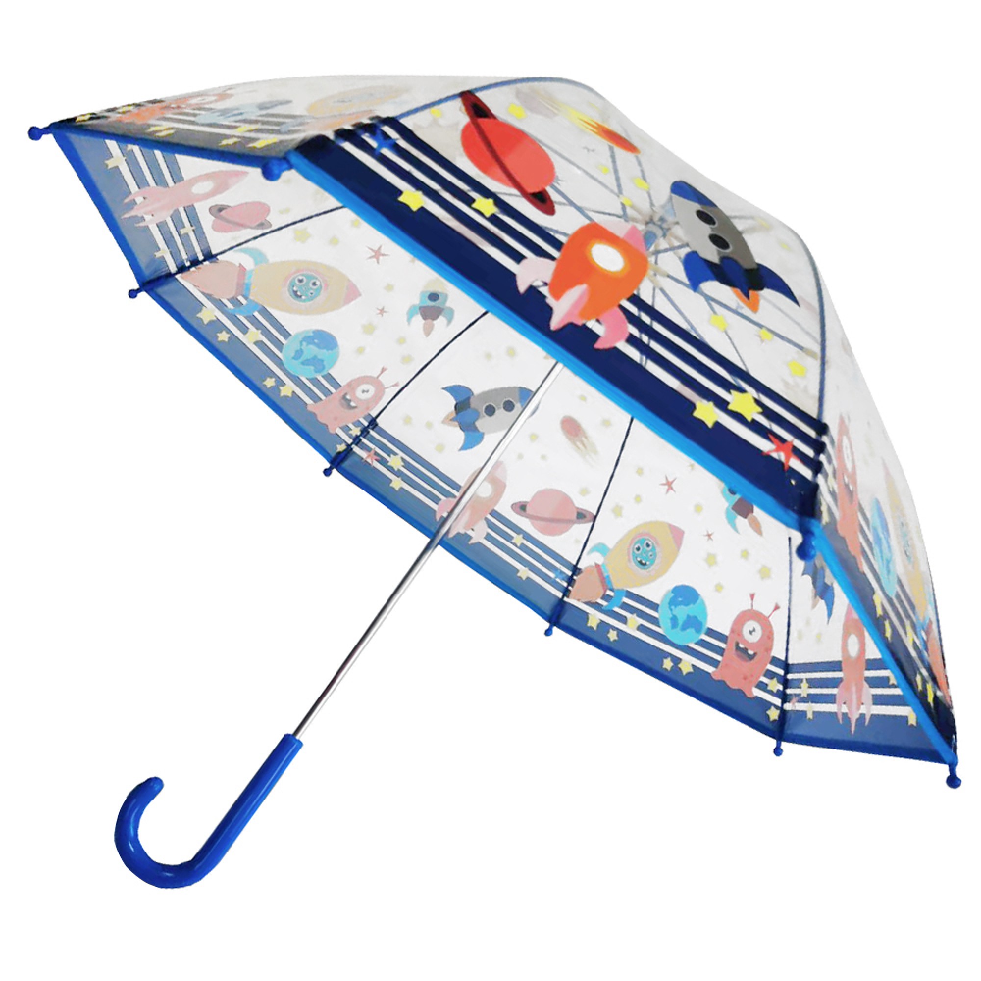 Ομπρέλα παιδική μονοκόμματη με χειροκίνητο άνοιγμα ασφαλείας, μεταλλικό χρωματιστό άξονα, 8 ακτίνες μήκους 45cm fiberglass, αντιανεμική, διάμετρος ανοιχτής ομπρέλας ≈ 90cm, POE embossed και λαβή μαγκούρα. ΔΙΑΣΤΗΜΑ