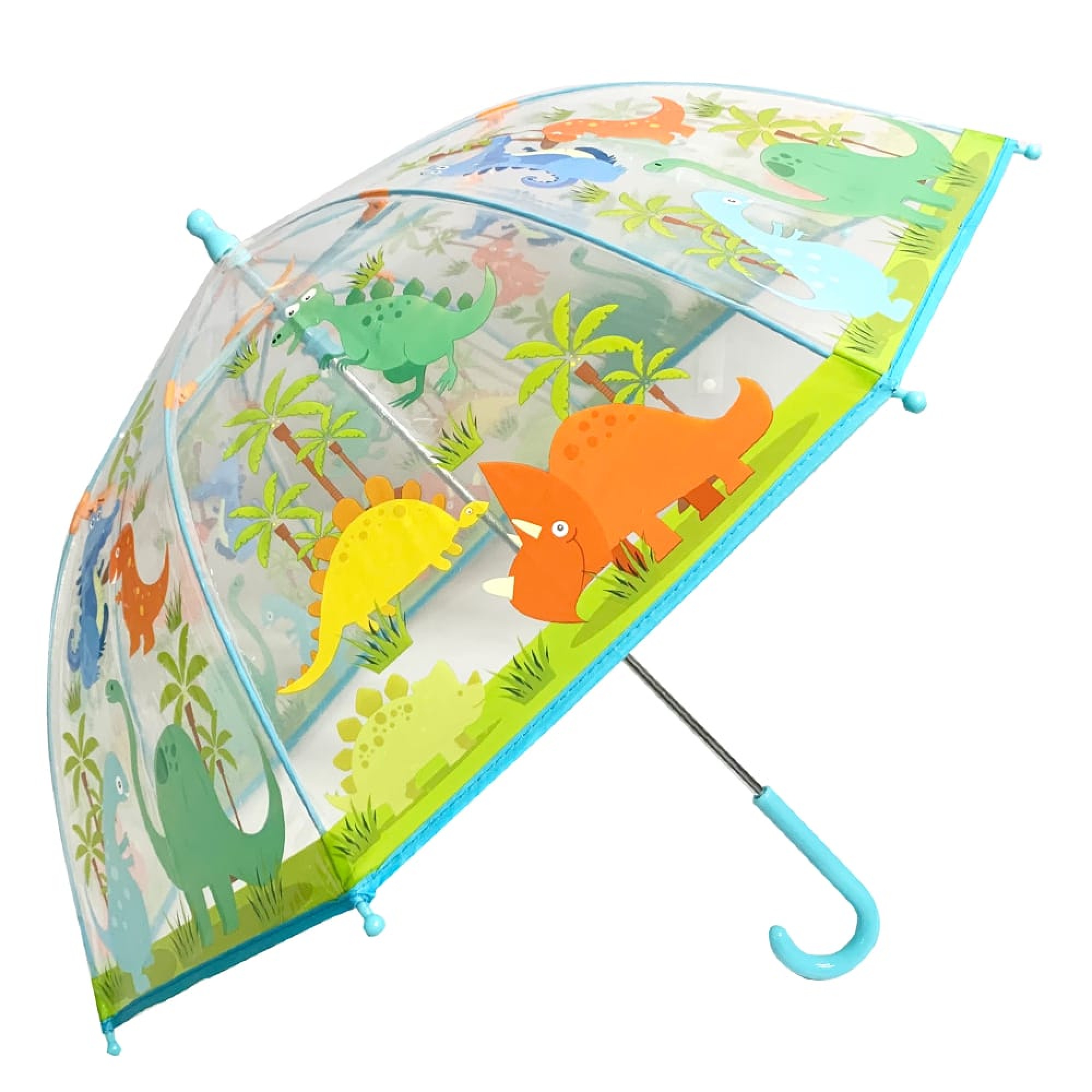 Ομπρέλα παιδική μονοκόμματη με χειροκίνητο άνοιγμα ασφαλείας, μεταλλικό χρωματιστό άξονα, 8 ακτίνες μήκους 45cm fiberglass, αντιανεμική, διάμετρος ανοιχτής ομπρέλας ≈ 90cm, POE embossed και λαβή μαγκούρα. DINOSAUR