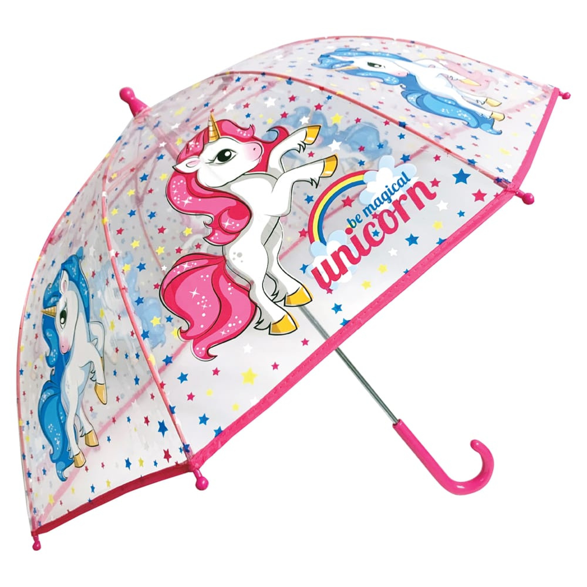 Ομπρέλα παιδική μονοκόμματη με χειροκίνητο άνοιγμα ασφαλείας, μεταλλικό χρωματιστό άξονα, 8 ακτίνες μήκους 45cm fiberglass, αντιανεμική, διάμετρος ανοιχτής ομπρέλας ≈ 90cm, POE embossed και λαβή μαγκούρα. UNICORN