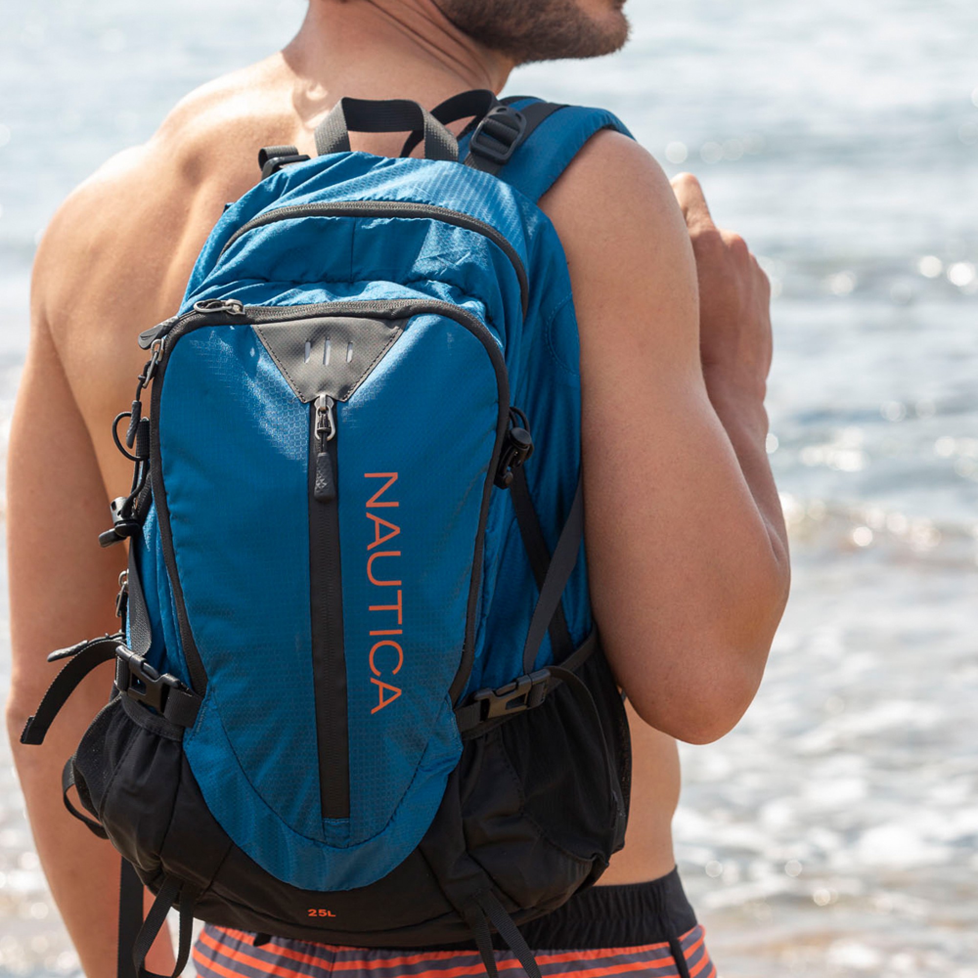 Σακίδιο Trekking 25lt. Υλικό: 210D ripstop water resistant nylon 400D. Διαστάσεις: 30x18x45,5cm. Bάρος 0,665 kgr. Αδιάβροχο. Ρυθμιζόμενη πόρπη και ιμάντες ώμου. Πολλαπλοί αποθηκευτικοί χώροι, ανατομική πλάτη. Σφυρίχτρα SOS ενσωματωμένη στην πόρπη στο στήθος. Τσέπη με φερμουάρ γρήγορης πρόσβασης. Σύστημα μαξιλαριού αέρα στην πλάτη με πλέγμα που βοηθά στην ροή αέρα μεταξύ της πλάτης και του σακιδίου. Εργονομικοί ρυθμιζόμενοι ιμάντες ώμου. Χρώμα μπλε. NAUTICA