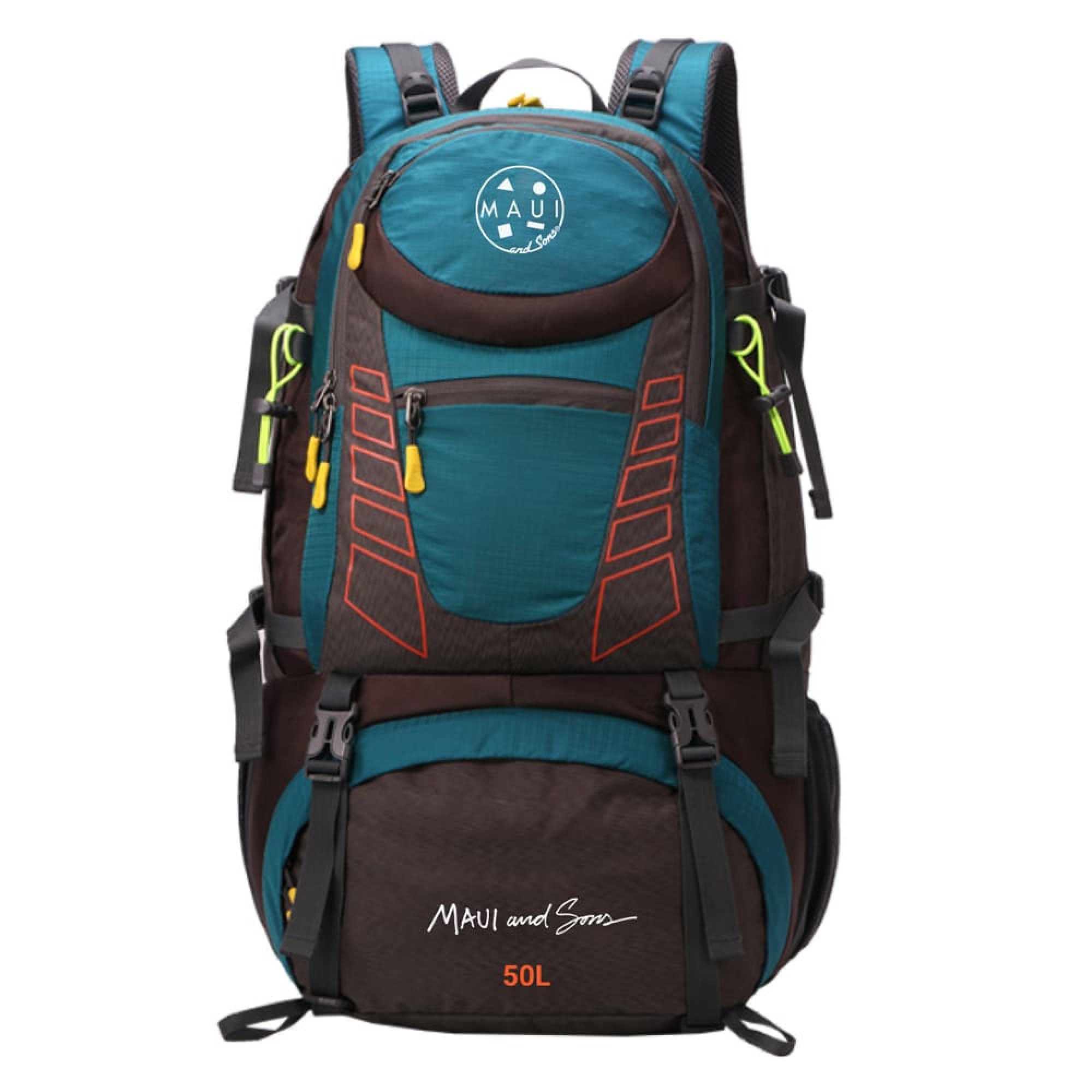 Σακίδιο Trekking πλάτης διαστάσεων: 35x23x55cm, χωρητικότητας 50lt. Κατασκευασμένο από nylon high density 100% 420D / 1680D. Ανατομική εργονομική πλάτη και ενισχυμένους ρυθμιζόμενους ιμάντες και λουράκι ζώνης μέσης με σφυρίχτρα. Πολλαπλοί αποθηκευτικοί χώροι. Εξωτερική θήκη με φερμουάρ για εύκολη και γρήγορη πρόσβαση σε προσωπικά αντικείμενα. Κατάλληλη και για πολύωρη χρήση σε υπαίθριες δραστηριότητες ή ταξίδι. Προστατευτικό κάλυμμα βροχής. Βάρος 1,28kgr. Χρώμα πετρόλ. MAUI&SONS