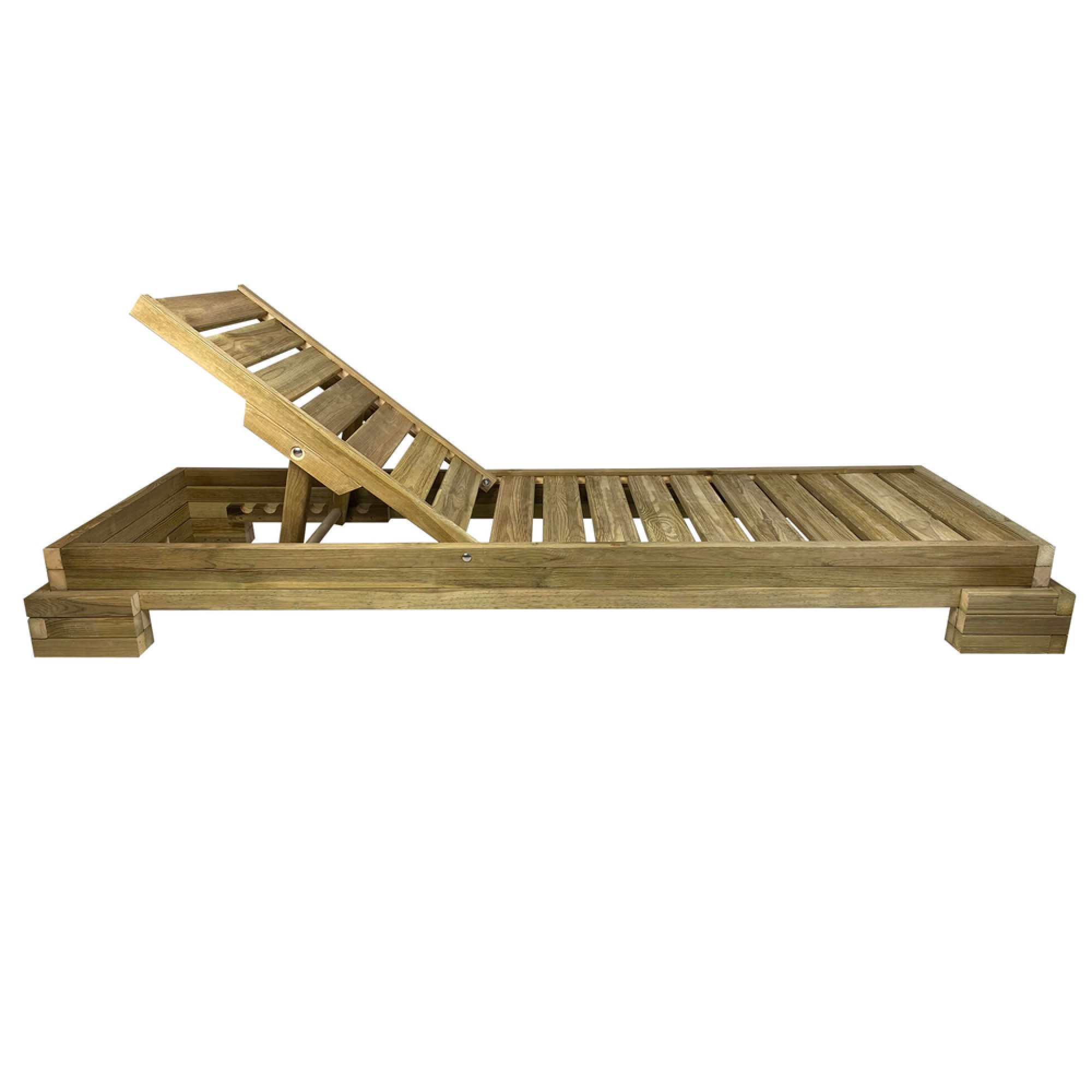 Ξαπλώστρα παραλίας διαστάσεων 217x75x23cm από εμποτισμένο μασίφ ξύλο σουηδικής πεύκης χωρίς βαφή για μέγιστη αντοχή, κατάλληλη για επαγγελματική χρήση. Σκελετός από 3 ενισχυμένες δοκούς διαστάσεων 13,00x3,6cm με πατούρα επί των οποίων στερεώνονται με ανοξείδωτους συνδέσμους σανίδες 9,5x2,1cm με ραβδώσεις με μεταξύ τους απόσταση 2,1cm. Εργονομική πλάτη 6 θέσεων κλίσης, μήκους 80cm με πλάγιους δοκούς διαστάσεων 4,7x3,7cm. Ενισχυμένα αποσπώμενα πόδια διαστάσεων 22,00x14,00cm. Βίδες Inox πάχους 8mm με παξιμάδι ασφαλείας.Σημείωση: Η ξαπλώστρα παραδίδεται αποσυναρμολογημένη.. Διαστάσεις πακέτου που περιλαμβάνει και 4 πόδια, 2 ξύλινες μπάρες, και 12 ανοξείδωτες βίδες: 200x68x32cm Βάρος: 25kg